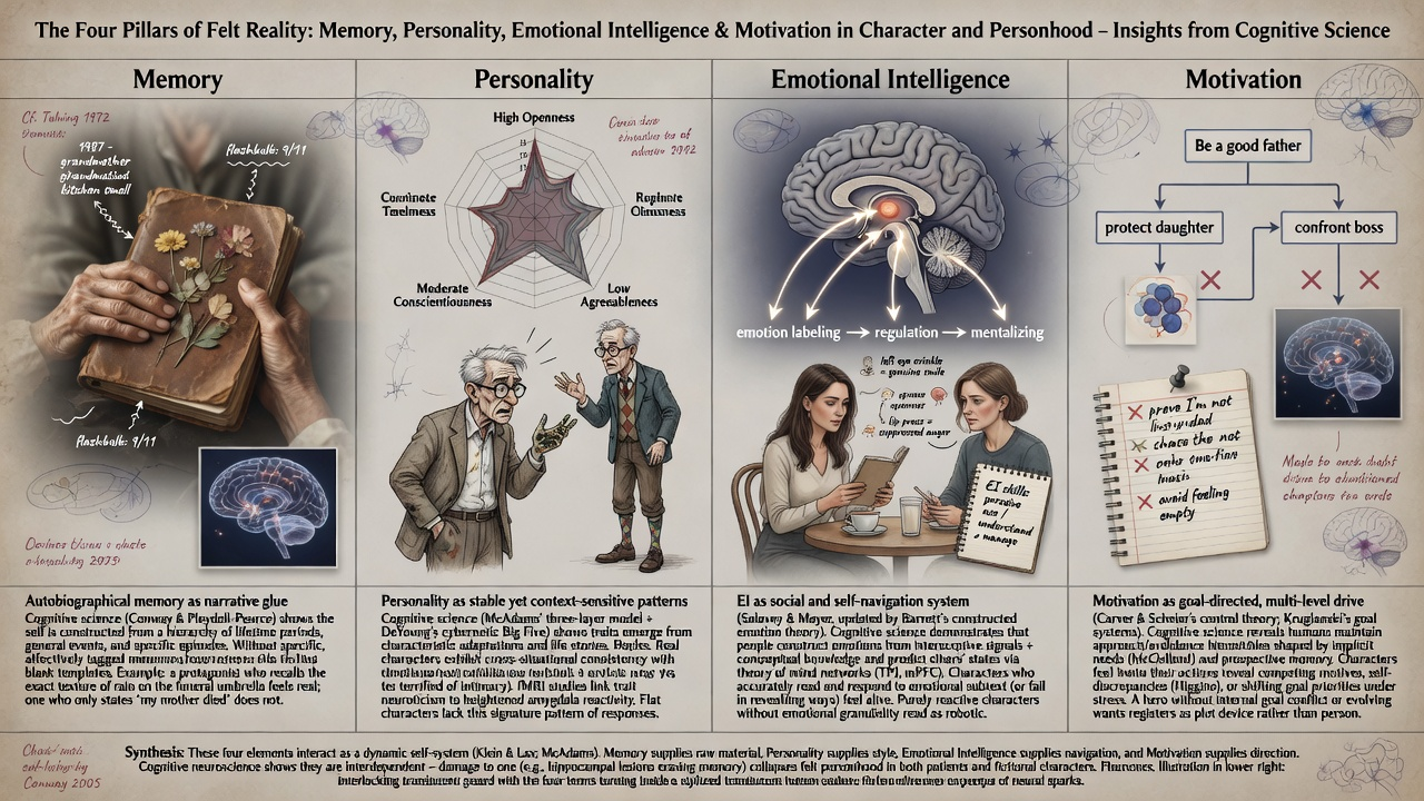 A scholarly look at why memory, personality, emotional intelligence, and motivation are the four things that make a character — or a person — feel real. And what cognitive science has to say about each of them.
