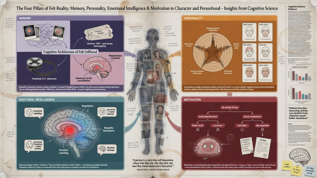 Step back and look at the four pillars together. Memory — the system that ties a being to their own history. Personality — the consistent pattern that makes them behave coherently across situations. Emotional intelligence — the capacity to read and respond to other minds. Motivation — the engine of wants that drives them forward in time. Put those four things in one being, and you have made something that, to any observer with a working theory of mind, will register as a person.
